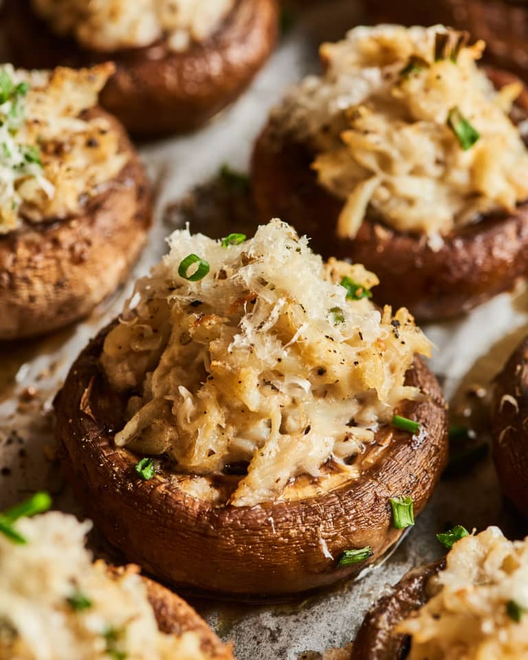 Award winning crab stuffed mushrooms. These crab stuffed mushrooms are mushroom caps filled with flaked crab and three types of cheese, then baked to golden brown perfection. Place in a greased baking pan, drizzle with olive oil, and season with salt and pepper. These mushrooms are versatile as well with many variations on the recipe. Choose good sized mushrooms, about 2 inches across.